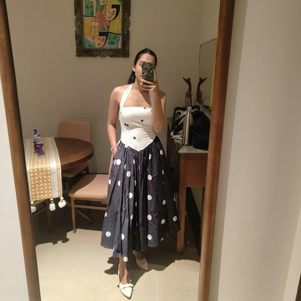 Crafted in premium cotton ,it features a halter neckline with adjustable ties at the nape, a structured strapless corset-style bodice with boning and princess seams in ivory white with scattered black polka dots, smocked detailing at the back for comfort and fit, a pointed hem at the waist that creates beautiful definition, and a dramatically gathered full A-line maxi skirt in jet black with large white polka dots that flows to the floor with breathtaking movement — perfect for gala evenings, black-tie events, or any moment that calls for show-stopping elegance.
